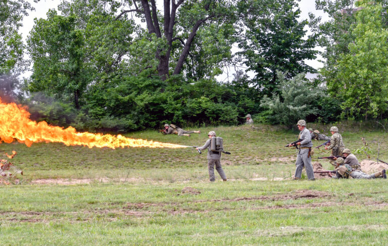 I watched a movie about the Marines on a Pacific Island in World War II on Monday night. In the film, a platoon attacked a bunker with rifles, grenades, and a flame thrower. The flame thrower was particularly dramatic; the Marine gripped the nozzle with both hands and pulled the trigger. With a loud whooshing sound the flames arced forward. He swept the nozzle back and forth; the flames were horrific.